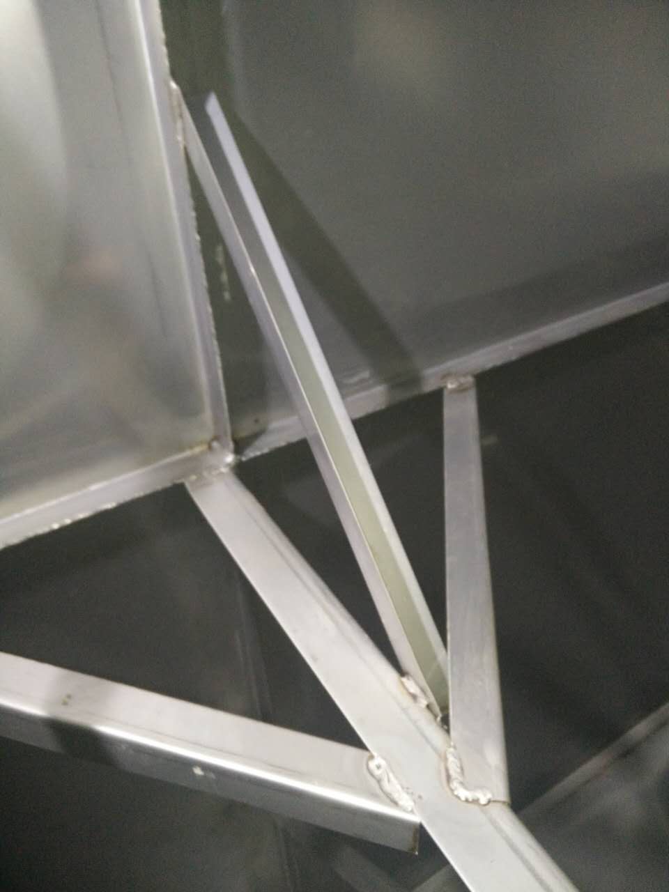 斜拉主要的作用在于分擔主拉筋的拉力,進一步對水箱板進行穩固,切成500mm的長度,連接在水箱與主拉之間。形成龍爪式,常規尺寸為4cm*1cm厚度一般以靠近頂部的側板厚度為基準,連接處必須進行滿焊處理。